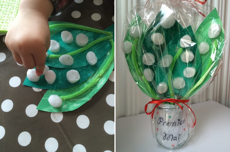 Il fallait y penser ! Des feuilles de papier, de la peinture, du fil chenille et des Playmaïs pour faire les petites fleurs de muguet. Le tout bien présenté dans un pot en verre. Un bouquet joliment emballé, prêt à offrir !